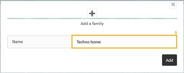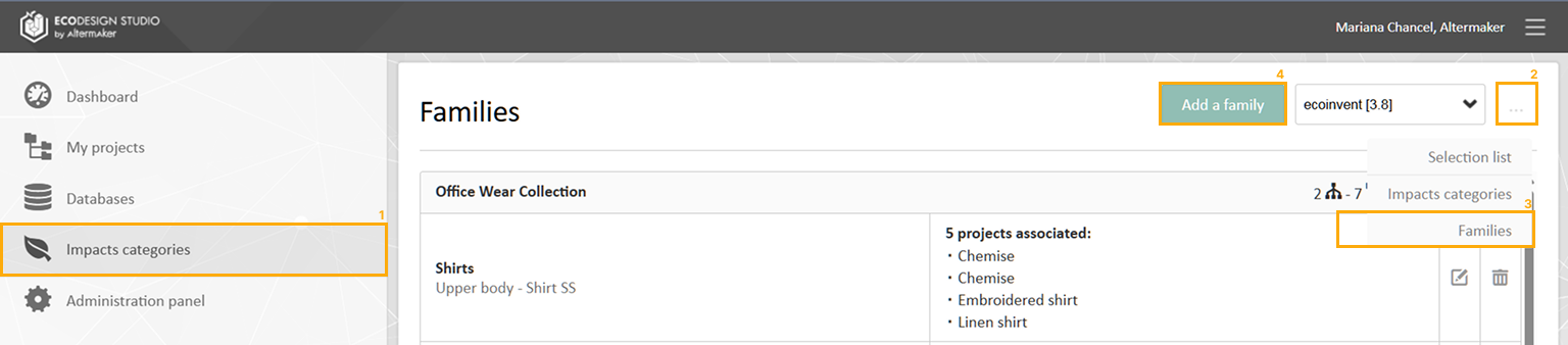 To create a family, go to the Impact categories menu (1), open the options list (2), select “Families” from the list, and click on the “Add a family” button (4).