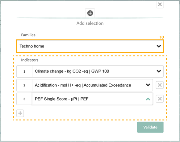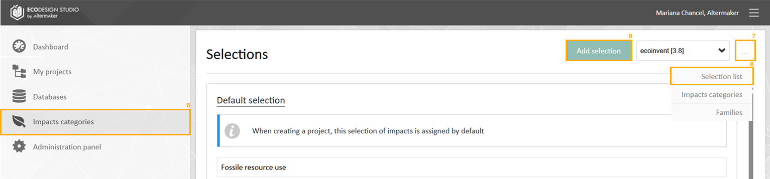 To add a selection of impacts, go back to the Impact categories section (6), open the options list (7), choose “Selection list” (8), and click on the “Add selection” button (9).