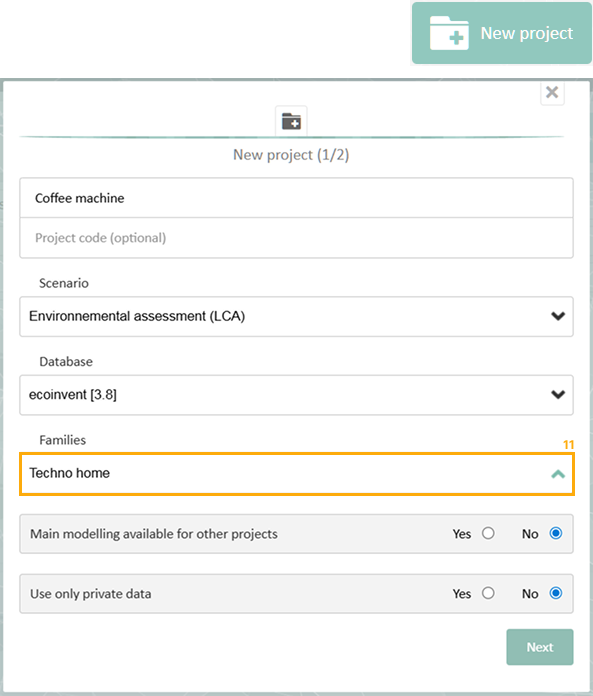 This function allows you to create project typologies with associated environmental impacts. You will then simply need to assign a family to your projects to associate them with impact indicators.