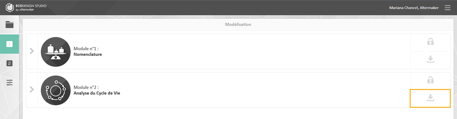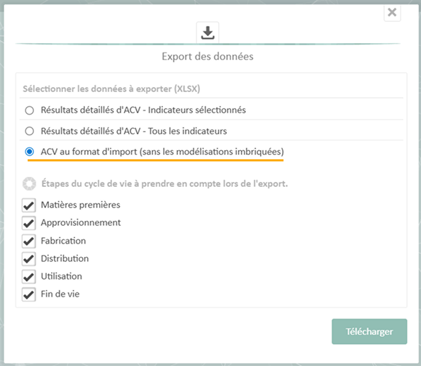 Le bouton de différents types d'export se trouve à droite du module Analyse du Cycle de Vie.