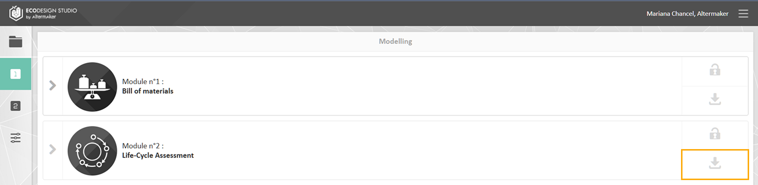 The button for different export types is located on the right side of the Life-Cycle Assessement module.