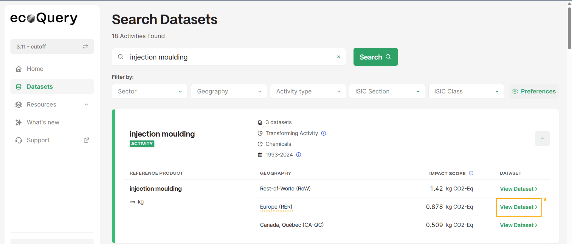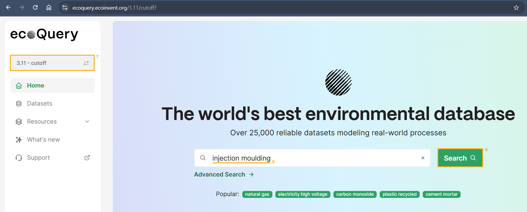 - Access the ecoinvent database website and enter "injection moulding" in the search field (5). Then click on the search button (6). Make sure the correct version of the database is selected along with the "Allocation, cut-off by classification" method (7). Click on the "View Dataset" of the required data (8).
