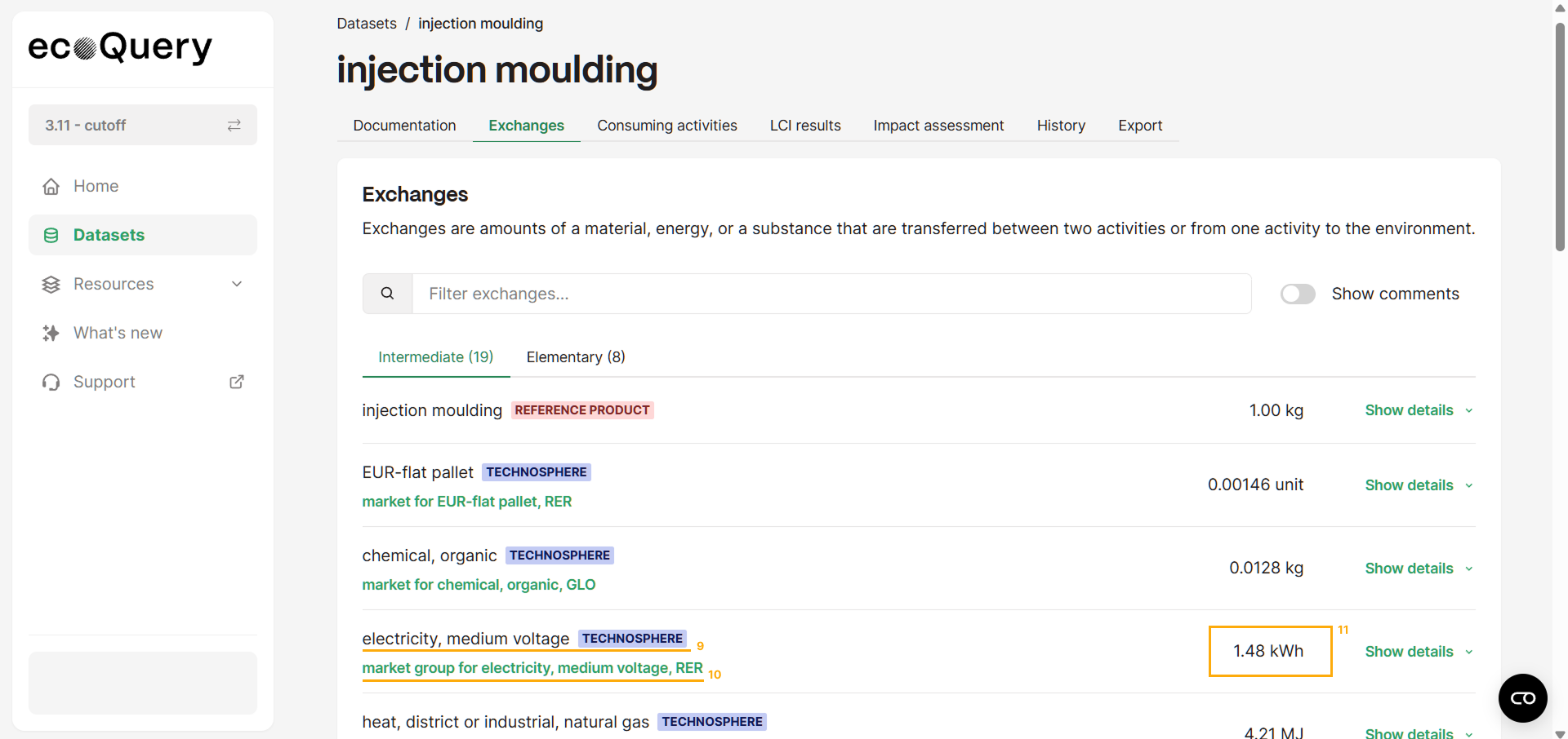 - Add three exported data to the Excel file to change quantities. For each environmental impact, the formula is: Impact Injection moulding - (electricity RER x 1.48 kWh) + (electricity FR x 1.48 kWh). (16)
